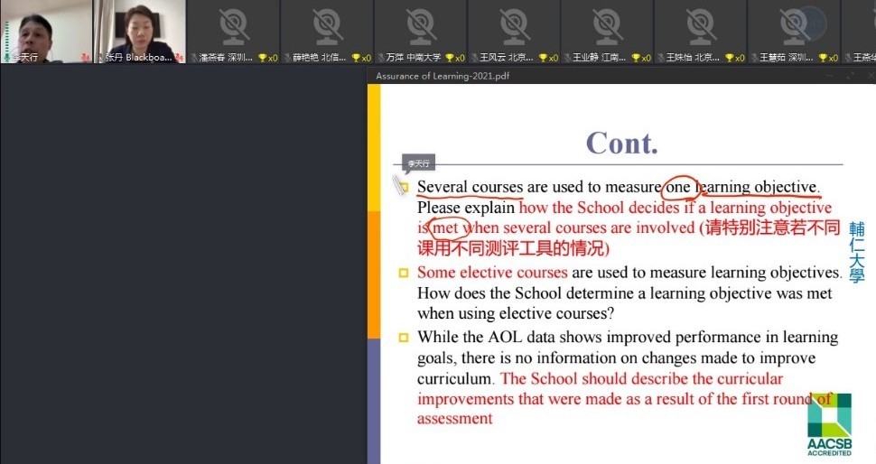From May 15 to 16, 2021, the "2021 Second Business School International Certification Training Seminar" hosted by Blackboard China Education Research Academy was successfully held online, with the theme of “AoL (Assurance of Learning) Advanced Application and Practice. More than 30 delegates from 13 universities convened online to have discussions on AACSB Certification. Professor Pan Yanchun, Deputy Dean of SZUCM, Associate Professor Wang Yanhua and Cheng Yuqiao, members of the school certification working group, and members of AACSB Certification Office Zhang Ruina, Wang Huiru, and Fengfeng attended the seminar.