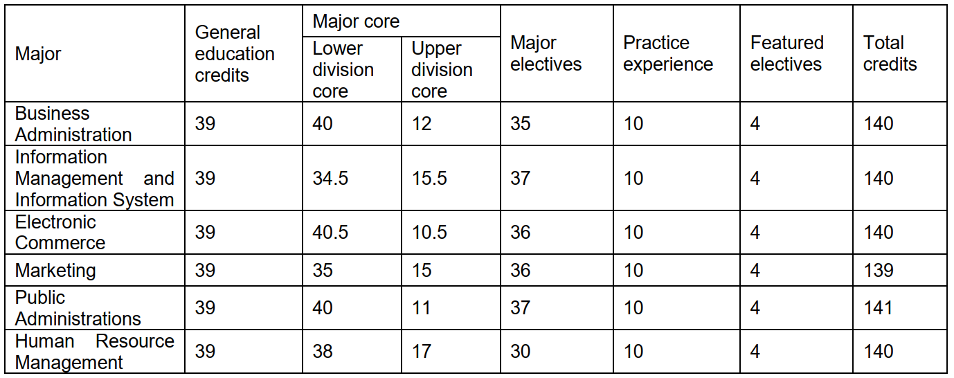 For the first 3 semesters (each semester covers half a year), College of Management provides the students with 7 compulsory basic courses on key management principles, including Principle of Management, PubliAdministration, Micro-economics, Macro-economics, Probability Theory, Principle of Statistics and Management Information Systems.