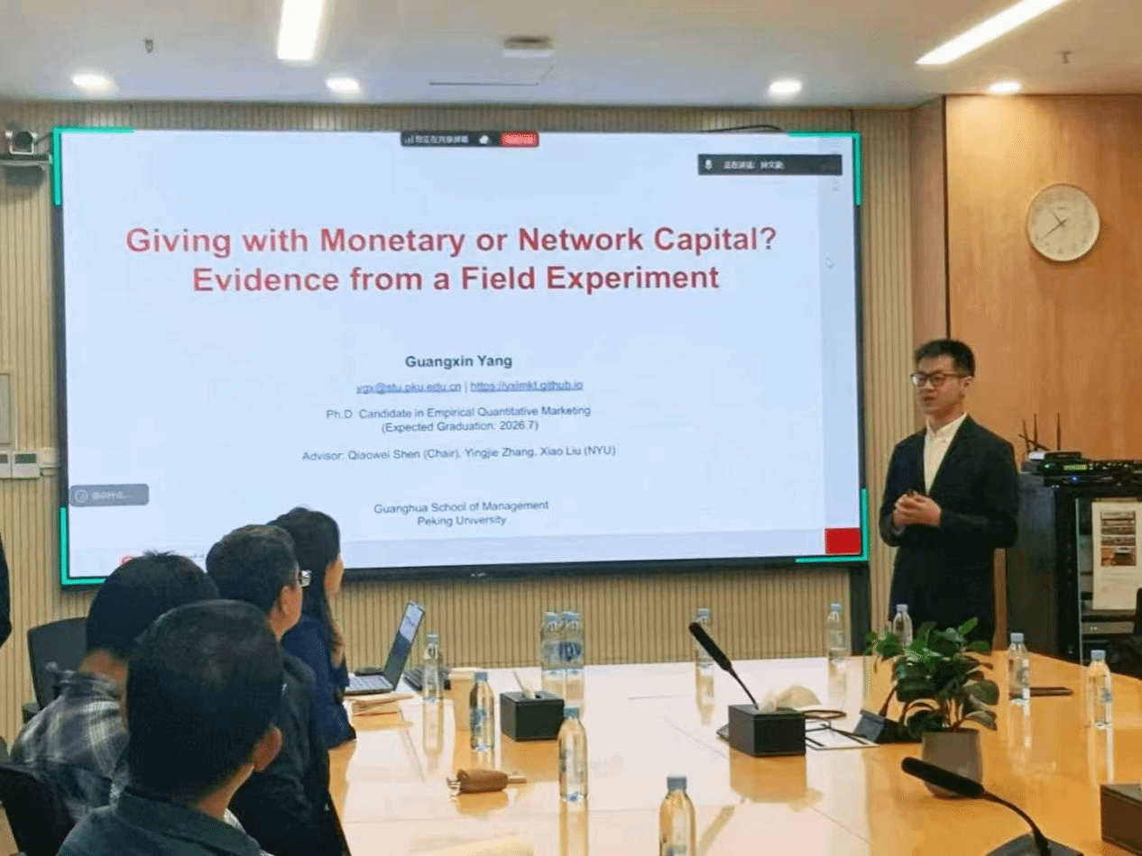On the morning of October 21, 2025, the 13th Session of the 2025 Youth Scientists Forum Series of the School of Management was successfully held in Room A302 of Mingli Building. Chaired by Professor Chen Xingyu, Vice Dean of the School of Management, the forum specially invited Dr. Yang Guangxin from the Guanghua School of Management, Peking University, to deliver an academic report titled "Giving with Monetary or Network Capital? Evidence from a Field Experiment". The forum received a warm response, attracting over 40 teachers and student representatives both online and offline.