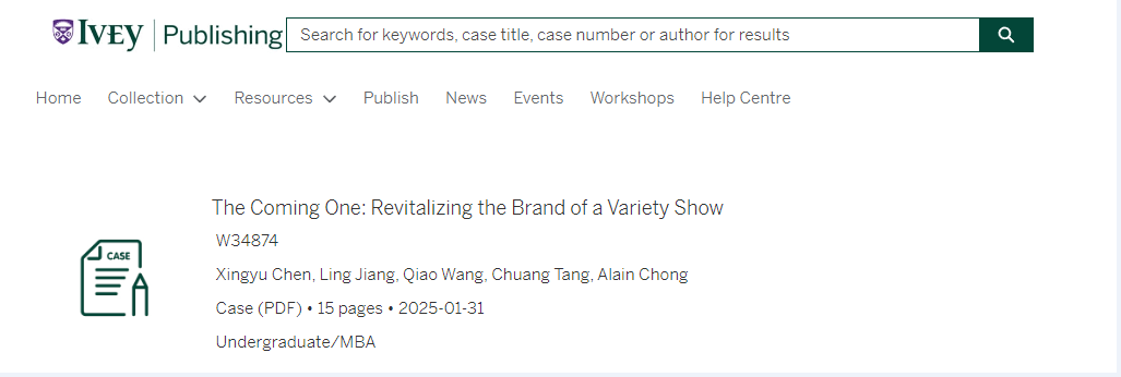 Recently, Dr. Xingyu Chen’s research team from the College of Management at Shenzhen University published a business case entitled “The Coming One: Revitalizing the Brand of a Variety Show” in the globally renowned Ivey Case Center. Dr. Xingyu Chen is the first author of this case, and the other collaborative authors include Dr. Ling Jiang who is currently an assistant professor at York University in Canada, Dr. Qiao Wang, a research fellow at our College of Management, Dr. Chuang Tang from the HSBC Business School at Peking University, and Professor Alain Chong from the University of Nottingham Ningbo China.